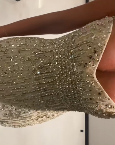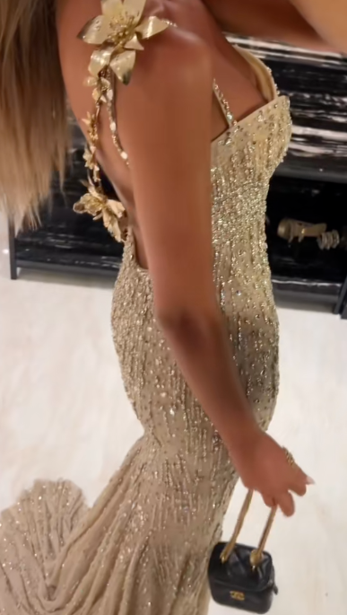 Designed to shimmer from every angle, it features a flattering heart neckline, delicate straps, and an open-back design adorned with cascading floral appliqué. Elegant, timeless, and perfectly fitted — this gown delivers luxury without the luxury price tag.