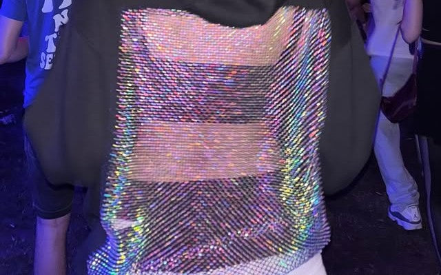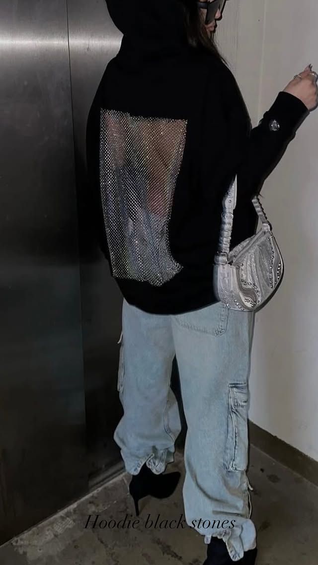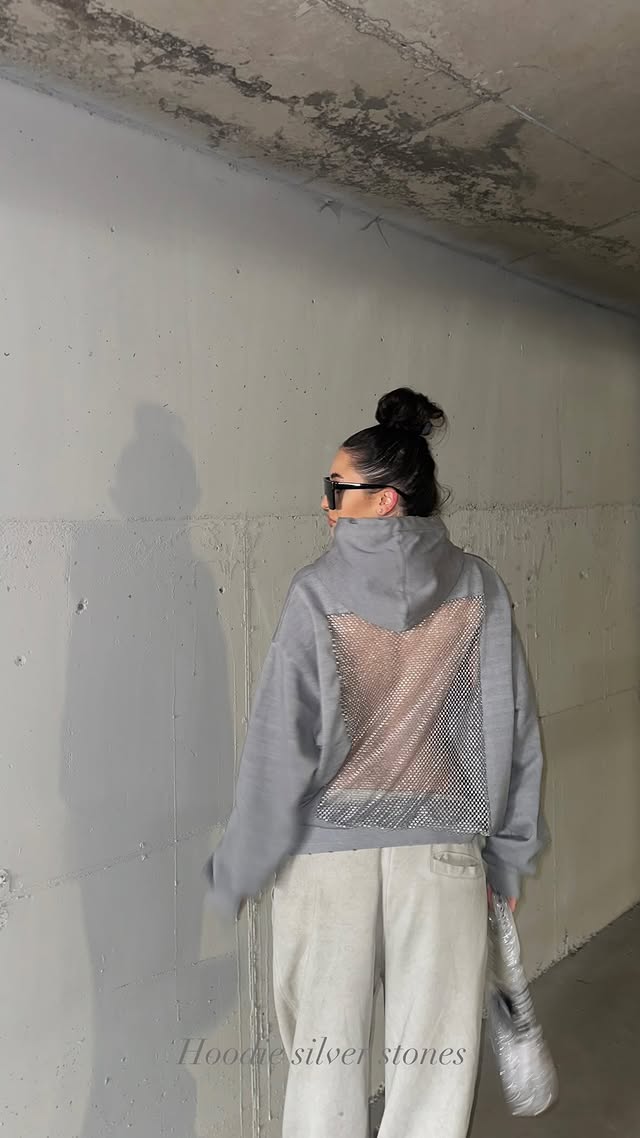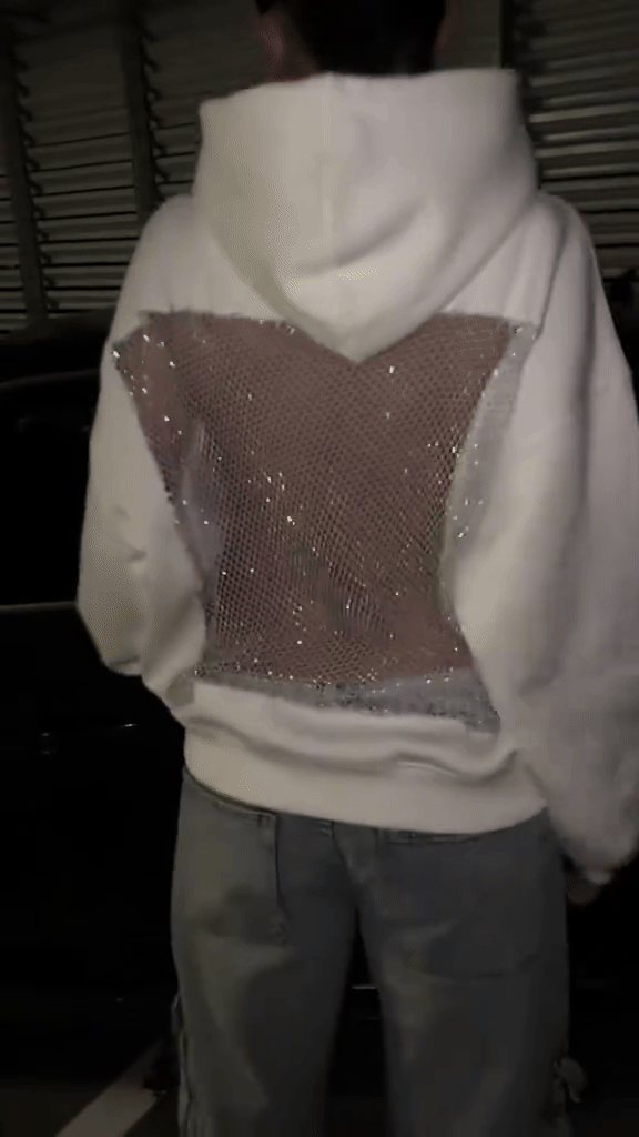 This isn’t your average hoodie. With a bold open back draped in crystal mesh, it’s built to turn heads and catch light with every move.